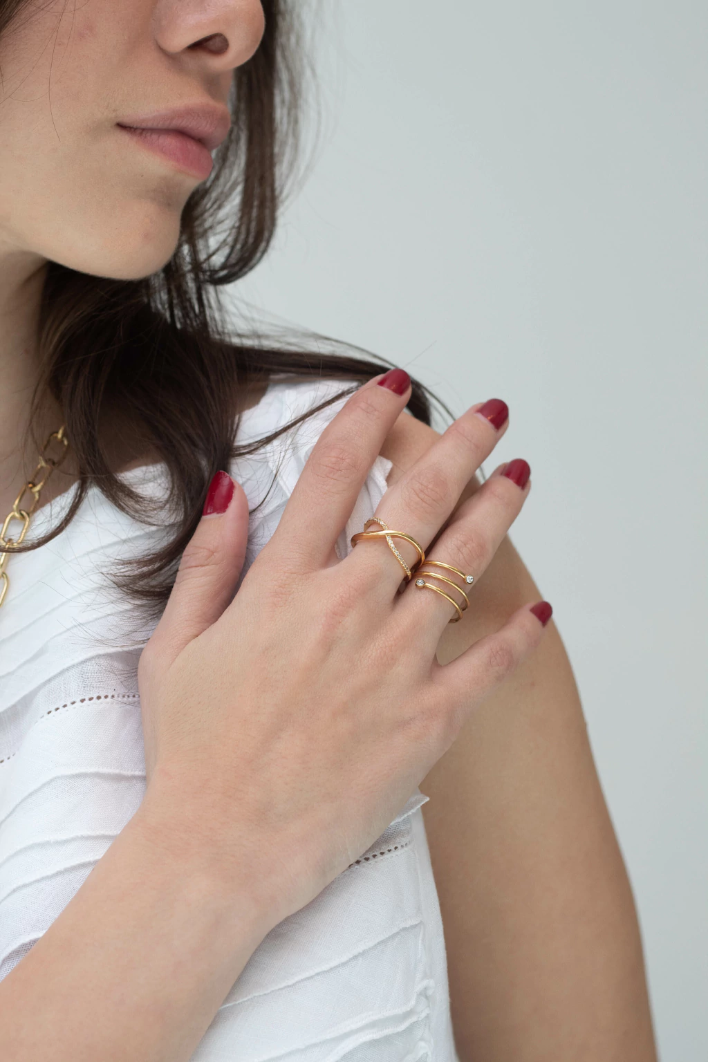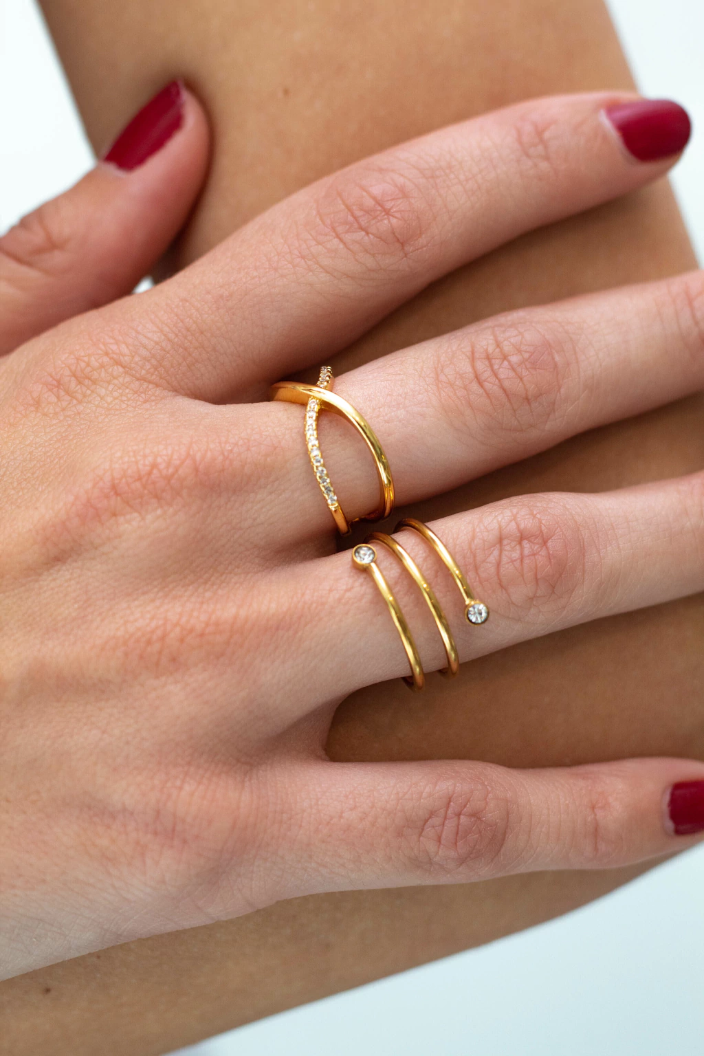 Anillo Nadine Elegancia y modernidad se combinan en este anillo de acero quirúrgico con baño dorado y plateado. Su diseño tipo cruzado, adornado con incrustaciones de strass, aporta un brillo sutil y sofisticado.