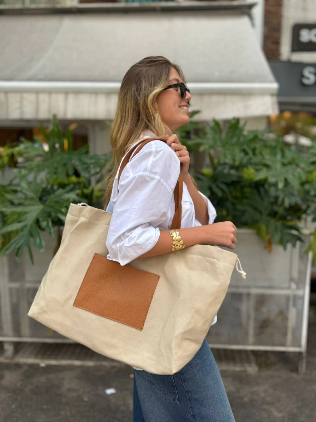 Bolso Agatha: estilo y funcionalidad en un solo diseño Este bolso de mano tipo playero, elaborado en Argentina, combina tela en tono crudo con detalles en cuero camel, creando un diseño único y sofisticado. Cuenta con una división a tono con cierre de funce, que aporta practicidad y un toque chic. Ideal para quienes buscan marcar tendencia sin perder comodidad. Un accesorio imprescindible para tus días al aire libre con estilo.