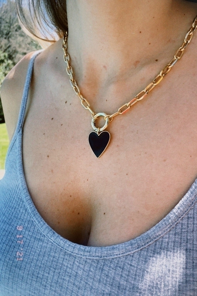 Collar Corazón con Mosquetón Este collar súper lindo y canchero es el accesorio perfecto para destacar tu estilo. Fabricado en acero quirúrgico con baño dorado, su encanto se complementa con un hermoso corazón esmaltado que aporta un toque único a tu look.