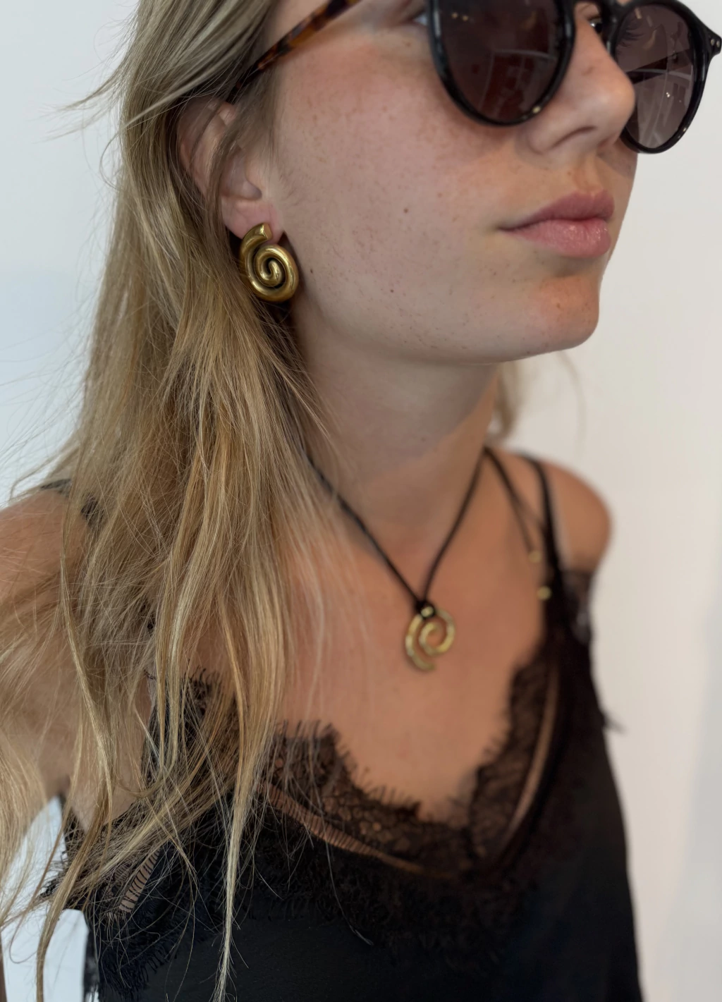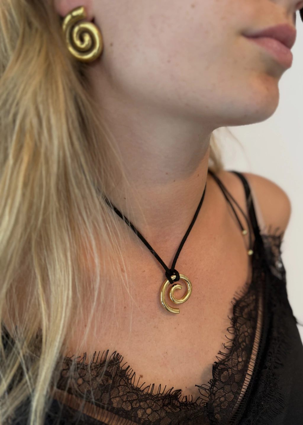 Collar de dije de acero quirurgico con baño dorado con cordon gamuzado negro.