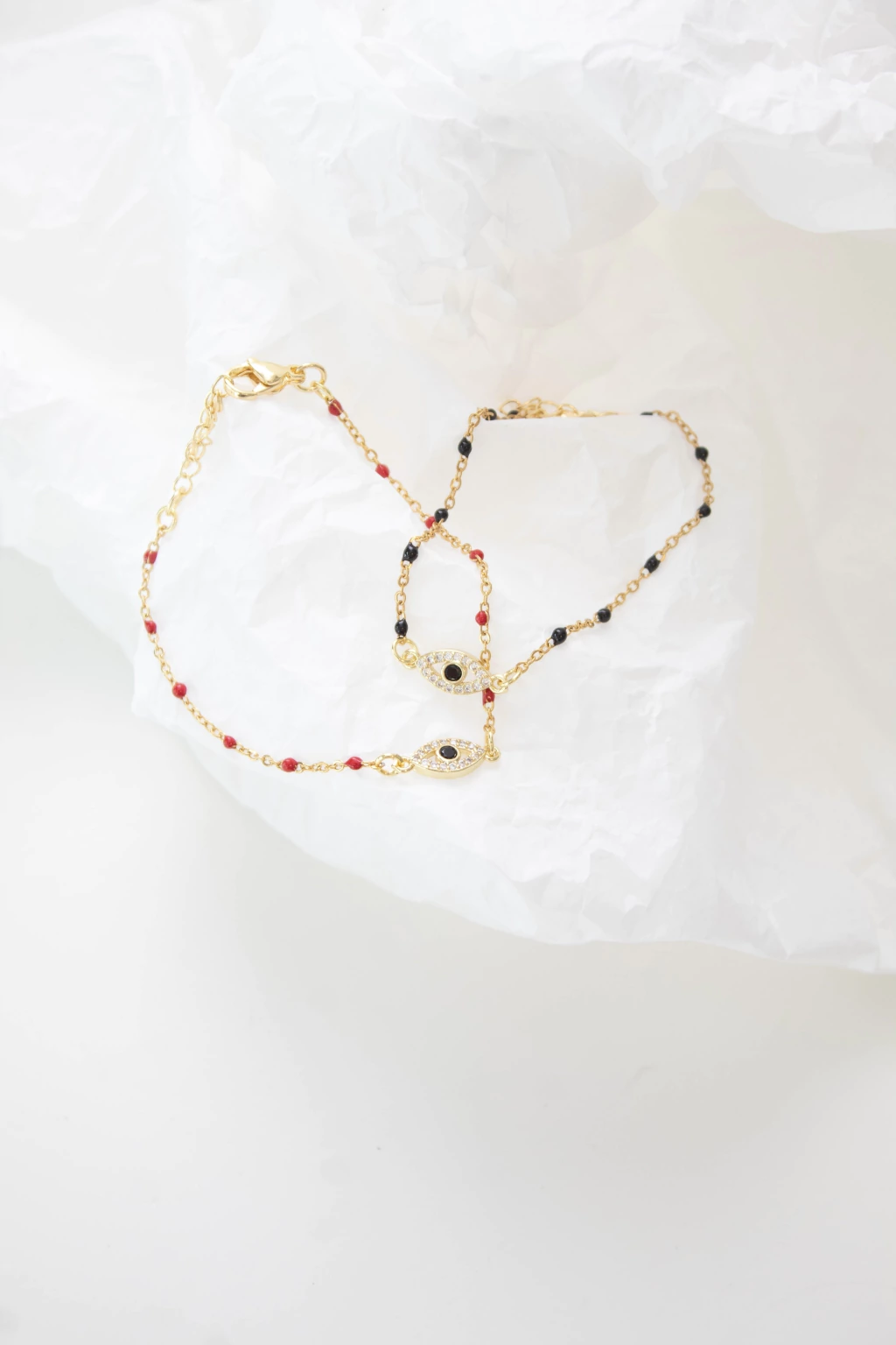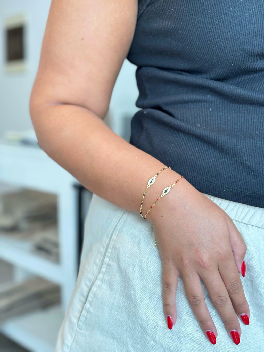 Descubrí nuestra Pulsera Salomòn, un accesorio elegante que combina bolitas negras o bordo con terminaciones en dorado. Su diseño incluye un dije de ojo con cubic, ideal para realzar tu estilo.